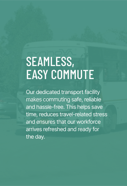 Our dedicated transport facility makes commuting safe, reliable and hassle-free. This helps save time, reduces travel-related stress and ensures that our workforce arrives refreshed and ready for the day.