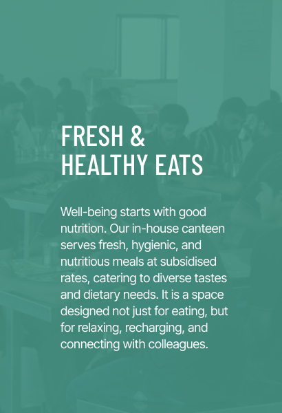 Well-being starts with good nutrition. Our in-house canteen serves fresh, hygienic, and nutritious meals at subsidised rates, catering to diverse tastes and dietary needs. It is a space designed not just for eating, but for relaxing, recharging, and connecting with colleagues.